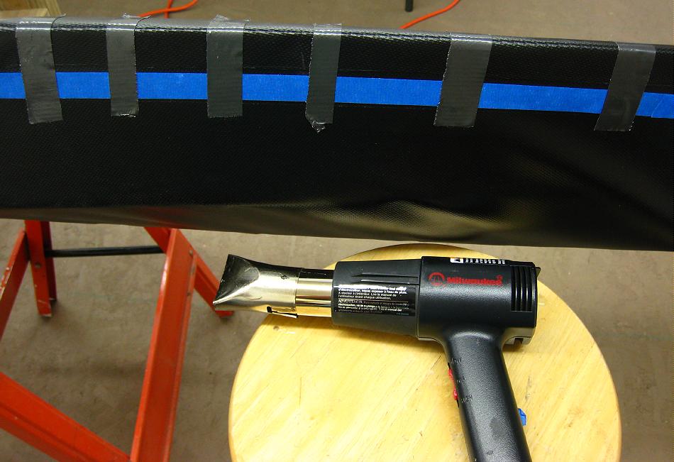 Once dry, overlap the deck and hull and tape in place. Apply heat and pressure to insure a good bond along the forward and aft deck sections. At the ends, trim the skin to fit over the stems.