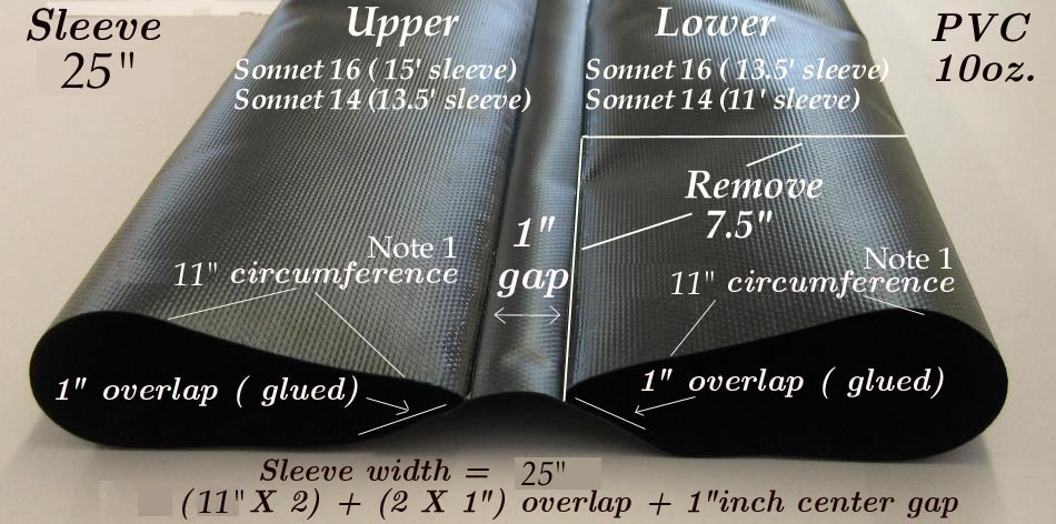 Note 1: Sponson circumference can vary between sponsons, and this must to be considered in determing the size of the sleeves. Before starting the PVC sleeve and PVC skinning process, read and understand the "PVC Skinning Section" of the Folding Kayak Builders Manual. It will discuss the materials and techniques to be used in great detail. The Inflatable / Folding Kayak Builders Manual will only address those skinning procedures that are specific to the Sonnet inflatables. Use the {Back} key to return. |