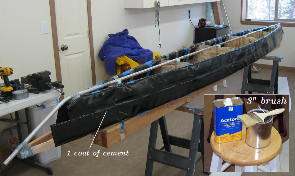 The area to be glued extends from the chine outer edge to the gunwale outer edge and along the entire length of the sleeve. One coat of vinyl cement is adequate on the sleeve and the inside hull skin. A cheap throw-away 3" brush works well for applying cement to this wide area. The sleeve area that folds over the gunwales and chines is not glued. Note: Vinyl cement should be applied to the sleeves at the same time as coating the inside of the hull skin.